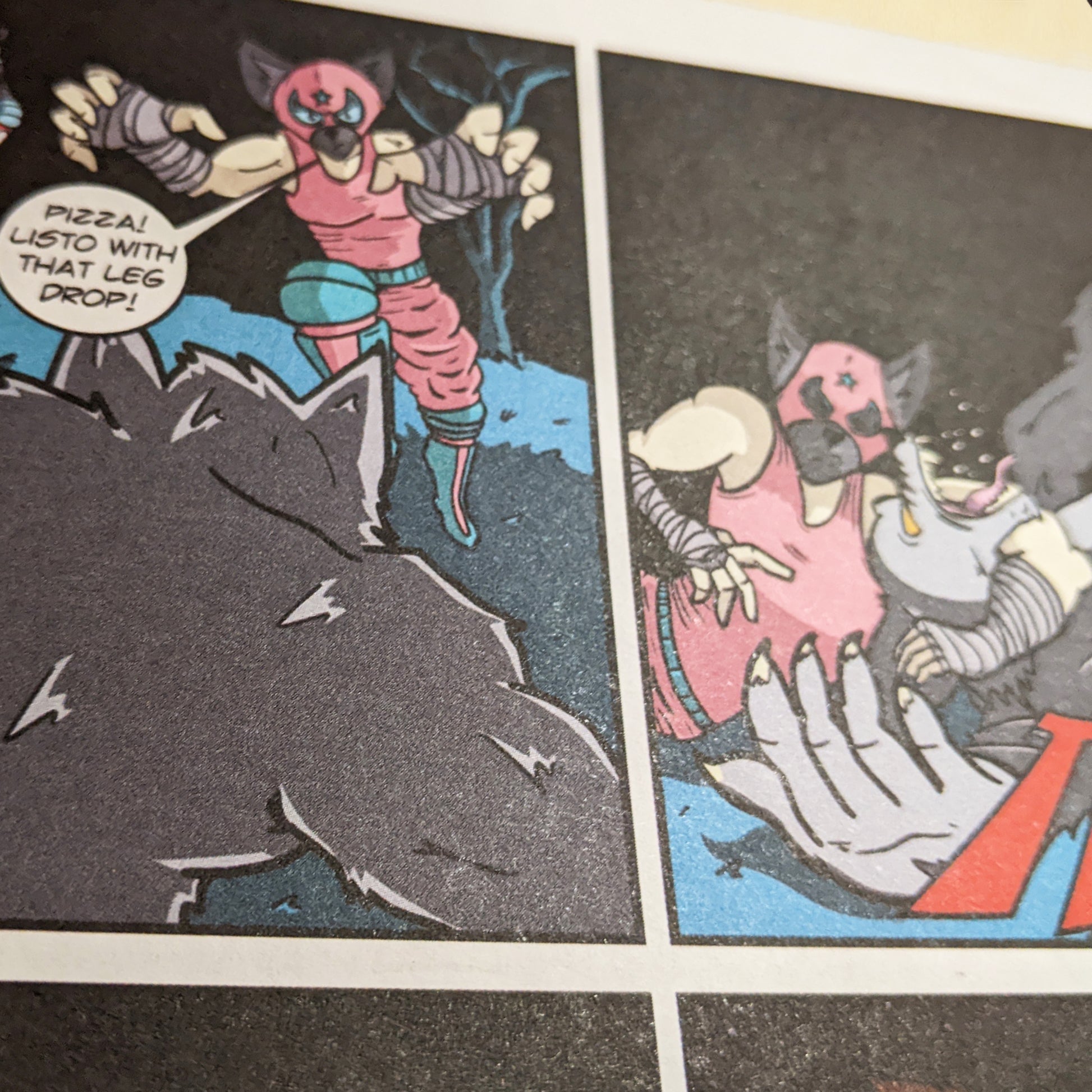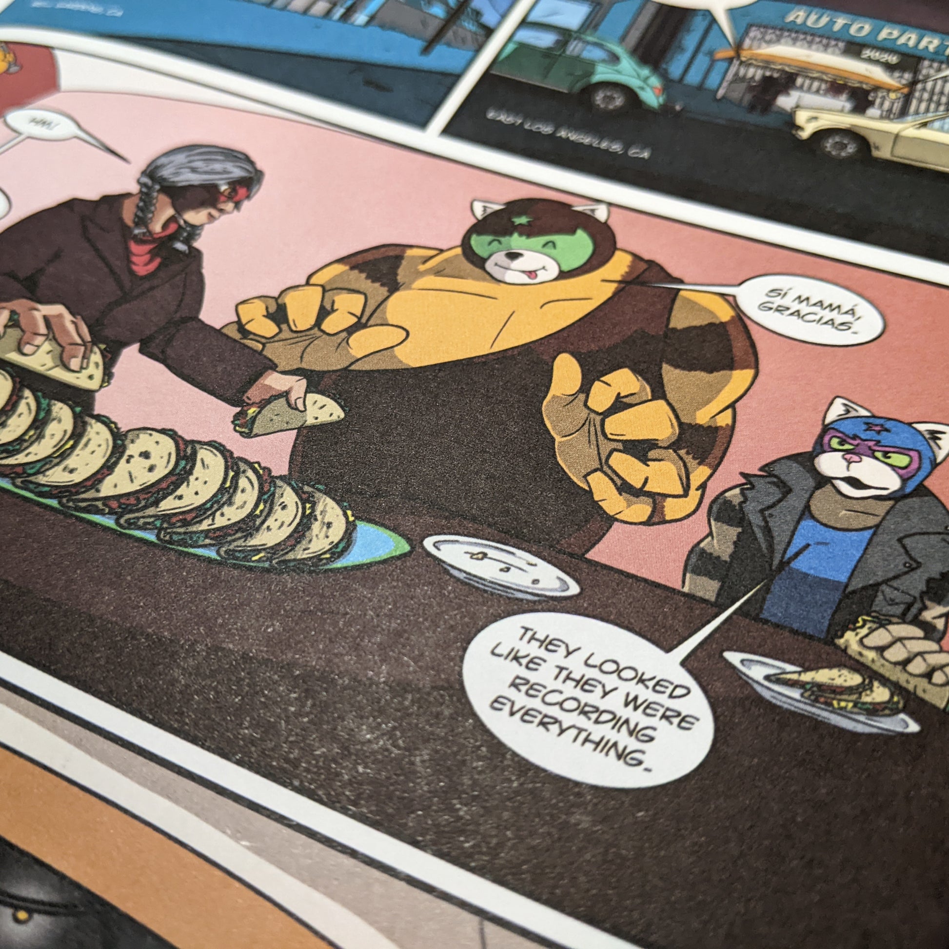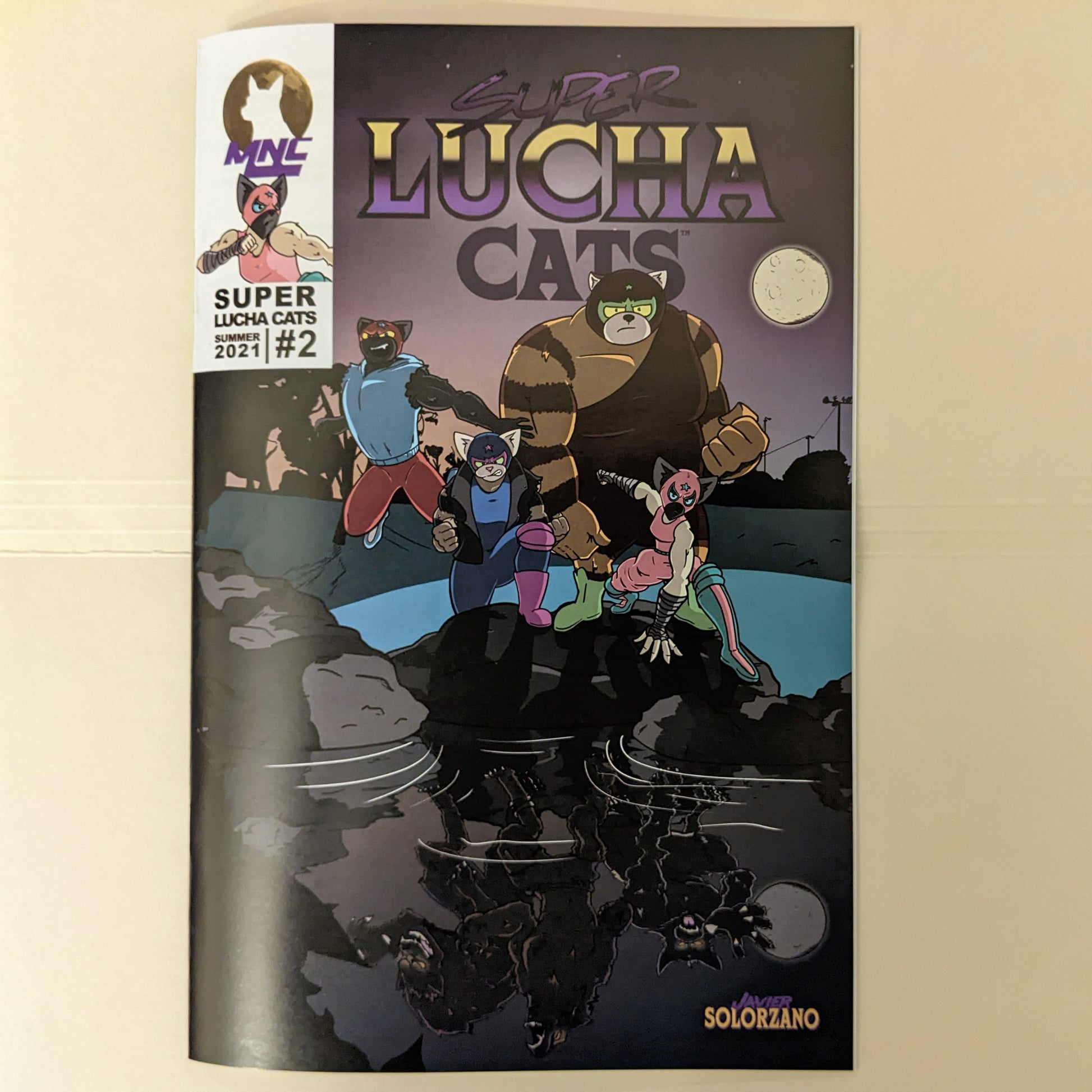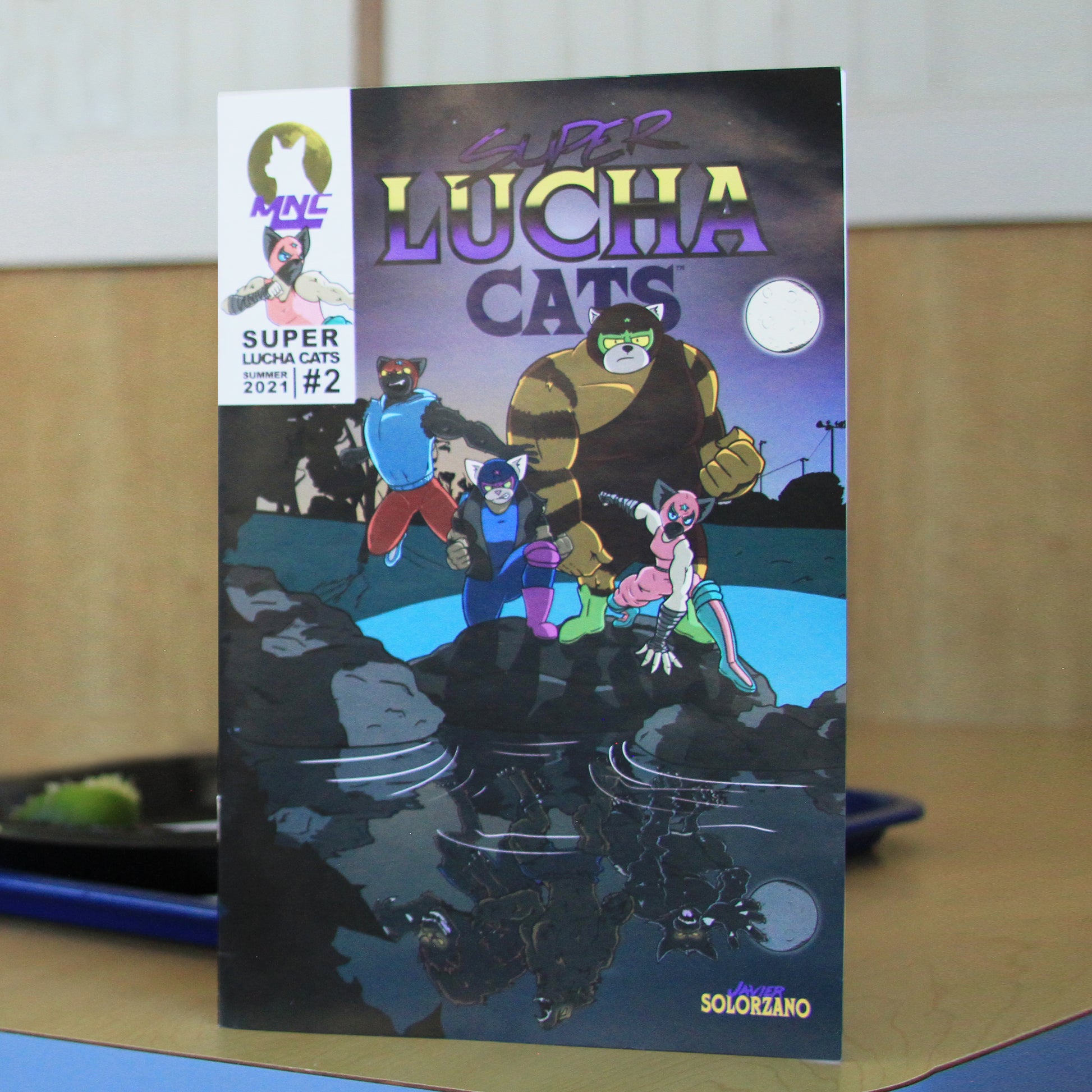 Full color, 24 pages printed in the USA. "Super Lucha Cats" Copyright 2023 Javier Solórzano.
